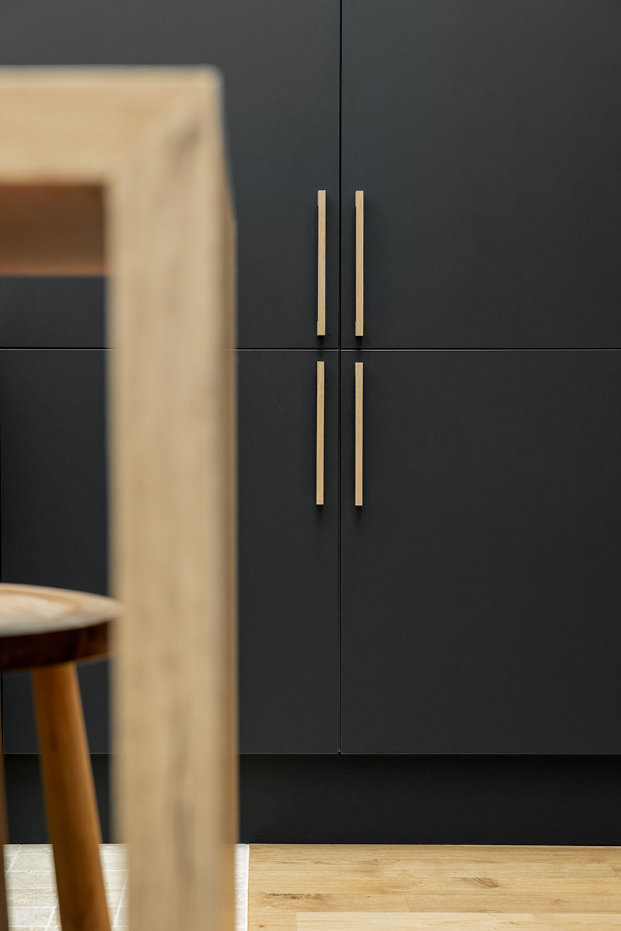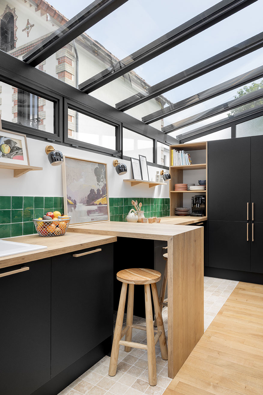 L’espace a été redessiné autour de lignes contemporaines et d’un jeu de matériaux contrastés : façades noir mat, zelliges vert profond, chêne naturel et touches de travertin.